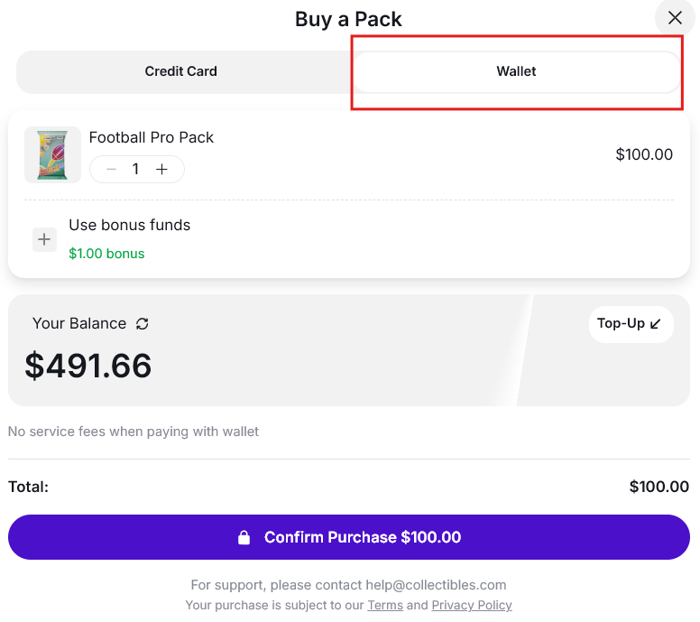- Log in to your Collectibles.com account and open the Wallet section.