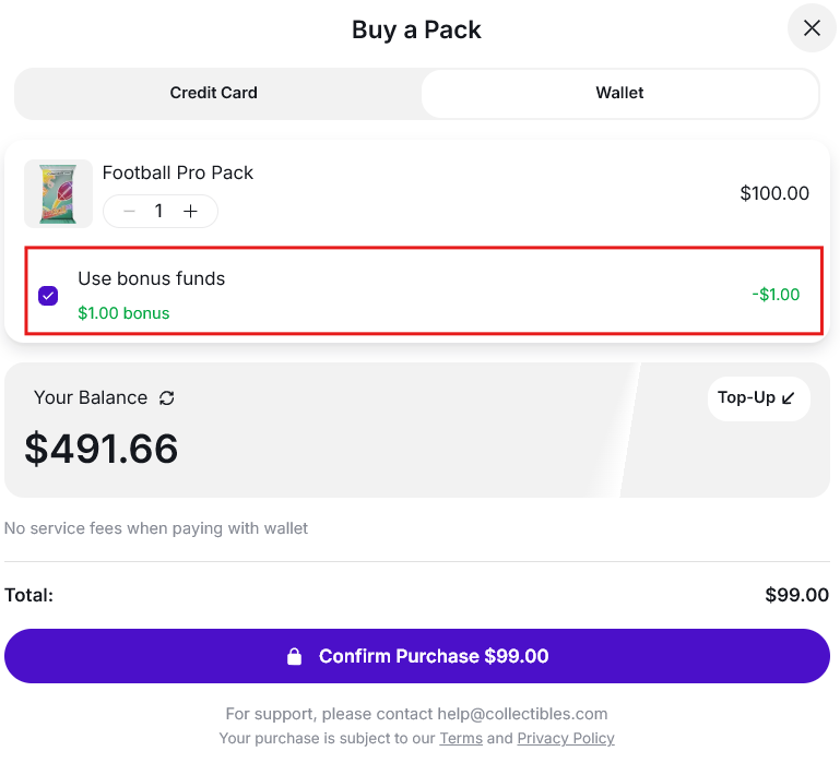 - Use wallet balance + bonus balance together by checking "Use Bonus Funds."