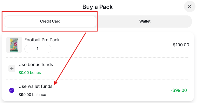- Use credit card + wallet balance + if your wallet doesn’t fully cover the purchase by clicking on the credit card option > check "Use Wallet Funds."> add your credit card information. Your wallet balance will be applied and deducted from the total.