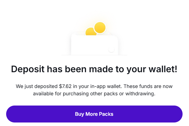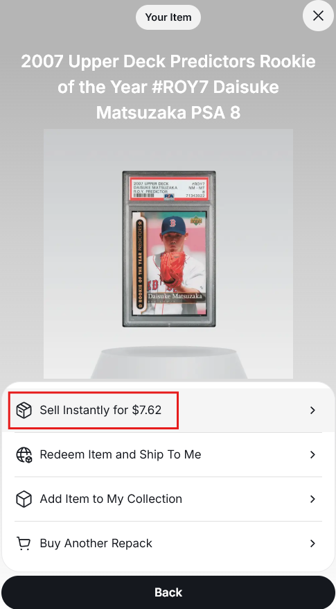 After you open a Repackz pack, you can sell any unwanted card back to Collectibles.com for 90% of its fair market value. A 6% restocking market fee is then applied, meaning your net buyback payout is 84% of the card’s fair market value. The net amount is added to your Collectibles.com account balance instantly, which you can use to purchase more packs or withdraw.