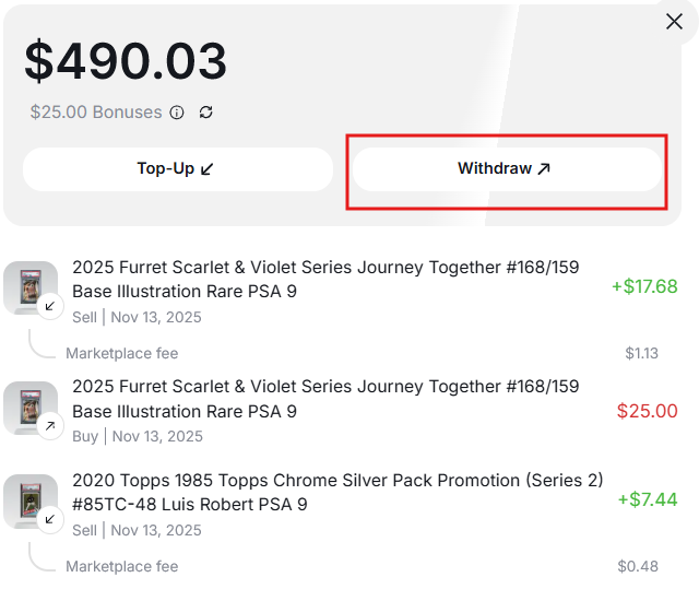 You can withdraw your balance on Collectibles.com using our payout partner, Coinflow. The process is fast and secure, and most users can complete verification and link their payout method in minutes.